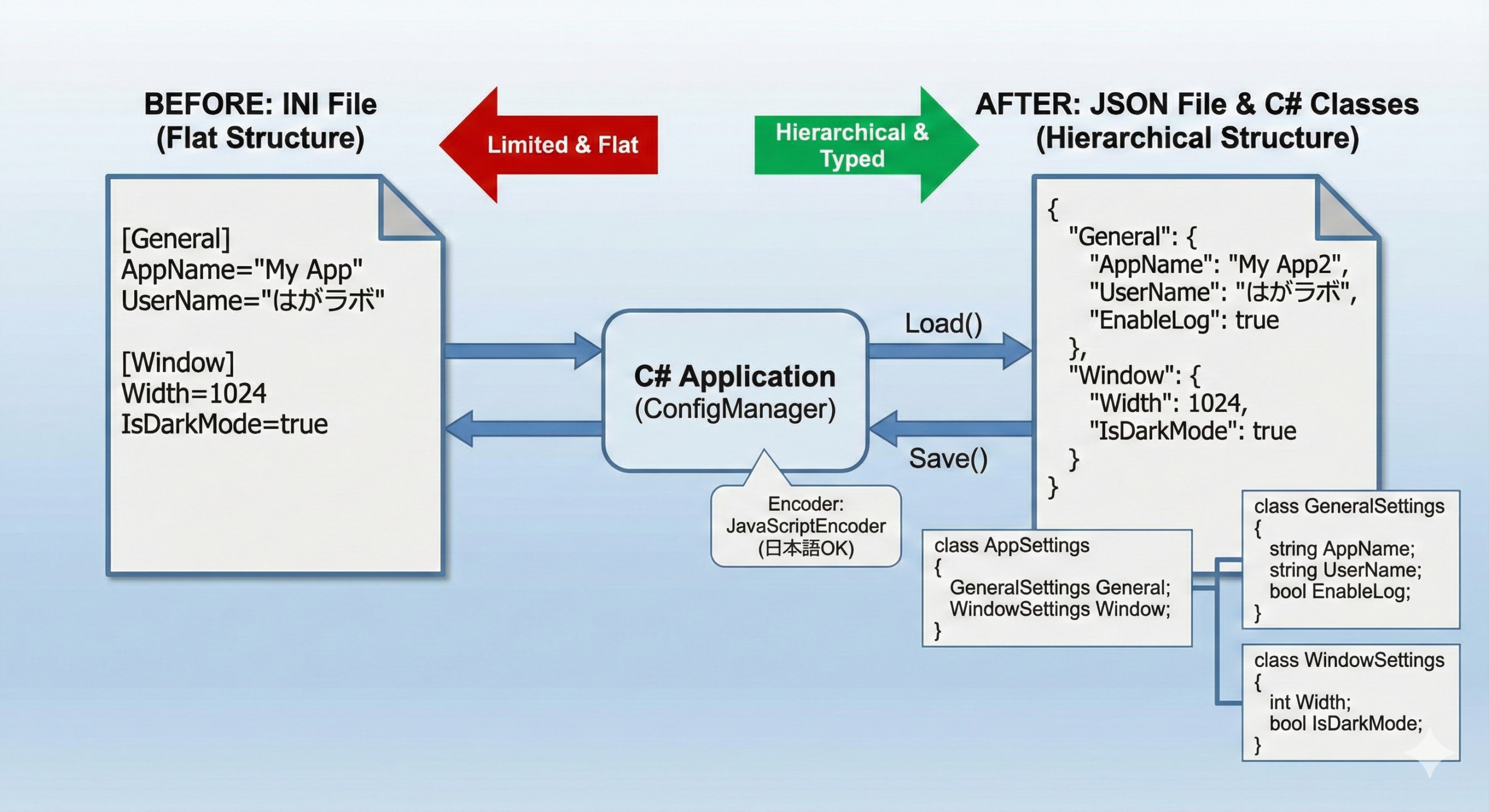 INIファイルからJSONへ移行することで、より複雑なデータ構造にも対応でき、モダンな開発環境との親和性も高まります。